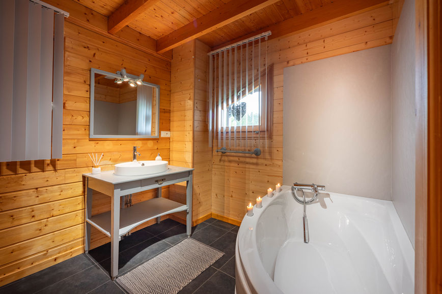 Le chalet dispose d'un WC séparé, d’une première salle de bain avec baignoire, sèche-serviettes et meuble vasque et d’une seconde avec une douche à l’italienne, sèche-serviettes, meuble vasque et WC.